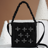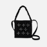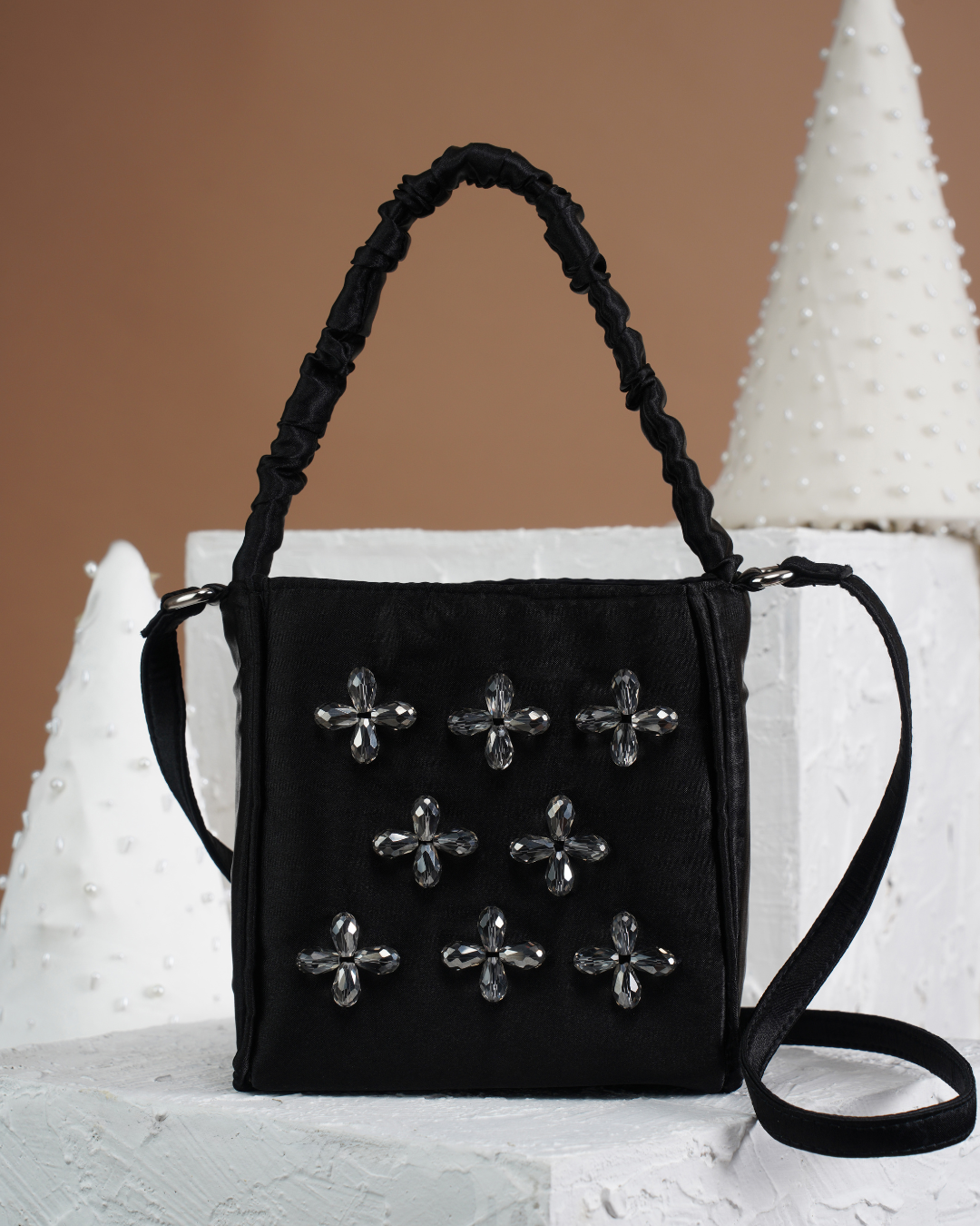 Midnight whispers in soft satin. The Midnight Box Bag is a structured square beauty adorned with shimmering crystal florals that seem to bloom under the moonlight. Designed with a ruched satin handle and detachable strap, it moves effortlessly between hand-carry and crossbody.