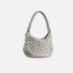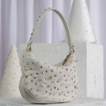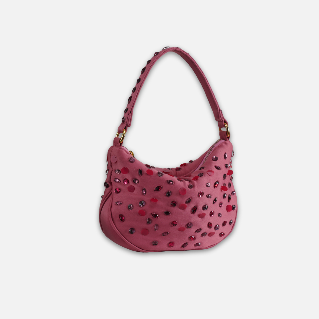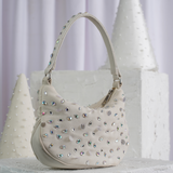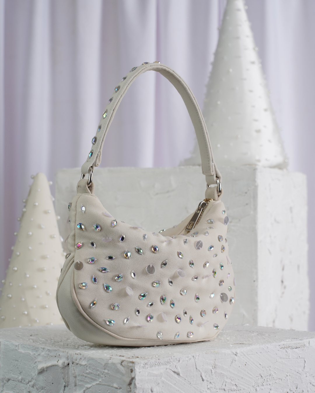 Orbiting elegance. The Across The Universe in Galaxy wraps your shoulder in soft satin curves and iridescent crystals, like a meteor shower captured in silk. With each glimmering embellishment, it promises to make the night yours. A cosmic delight in the palm of your hand.