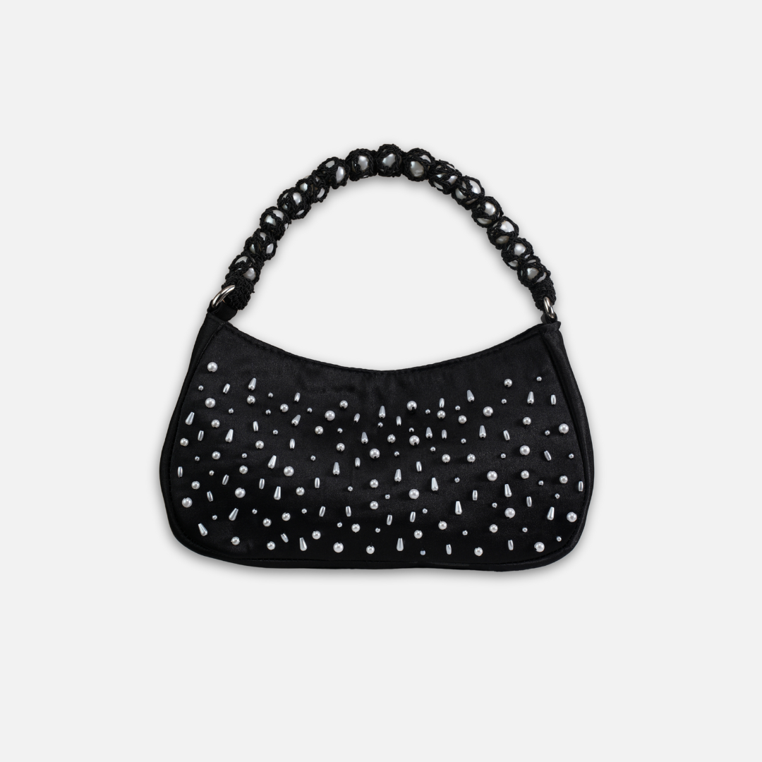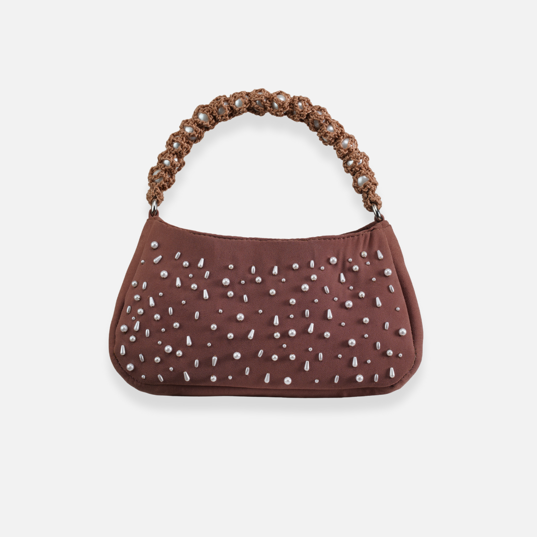 Warm like sunset and rich like caramel, the Muitara in Gula features a smooth satin crescent silhouette, scattered with delicate pearl-like beads. Its magic lies in the handle - hand-crocheted yarn wrapped around luminous white pearls - a tactile tribute to craftsmanship and artful design.